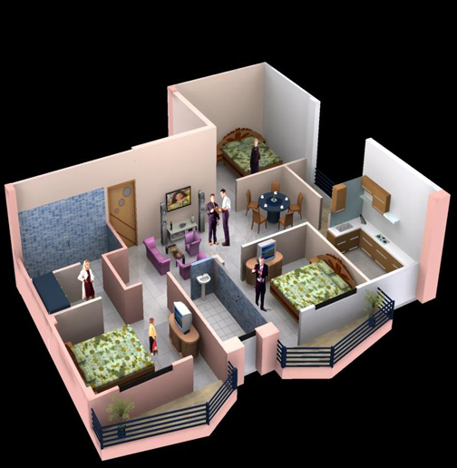 Walls : Tiles upto 2’ height above the counter level, Balance P.O.P. finish.